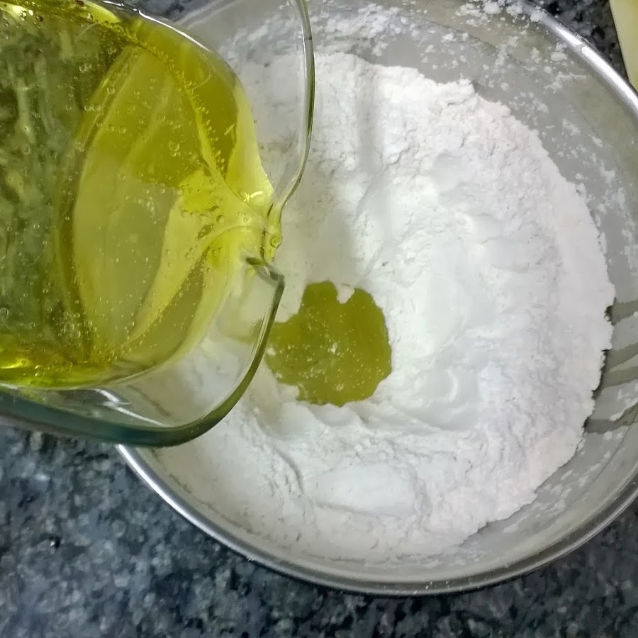 2. En otro recipiente mezclamos el agua templada con el aceite de oliva
