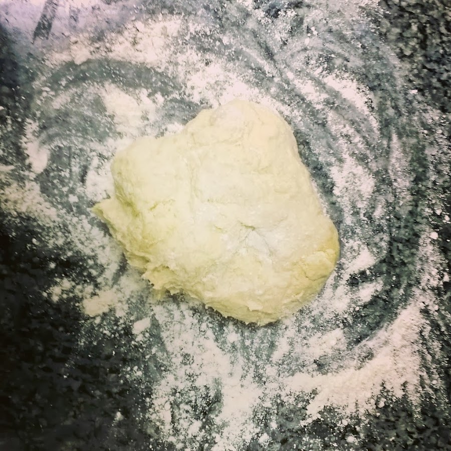 4. Enharinamos ligeramente una mesa y amasamos unos 10 minutos con las manos, hasta que quede una masa suave y elástica. Una manera de saber que la masa esta lista será comprobando que al presionar ligeramente con el dedo hacia adentro la masa recupera su forma rápidamente.