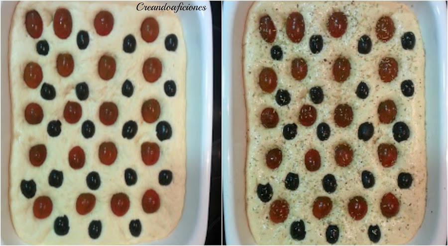 Hacemos con los dedos unos agujeros para poner los tomates, cortados a la mitad y las aceitunas.