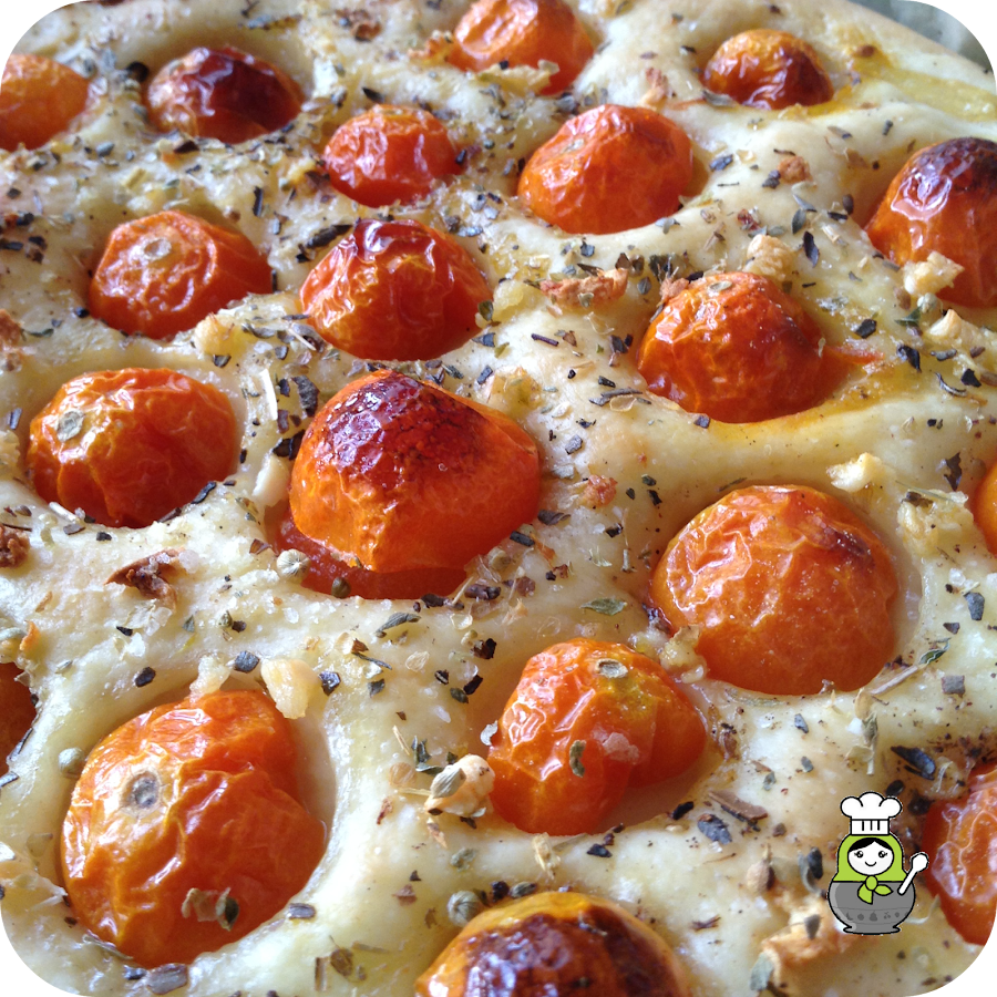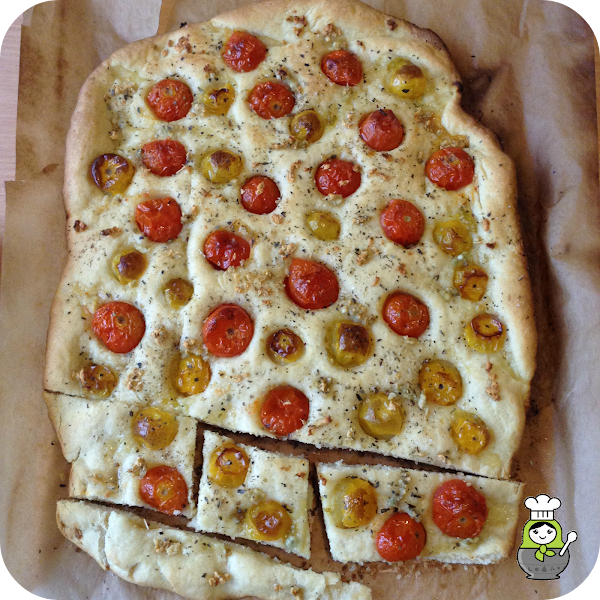 Es ponernos a escribir esta entrada y empezar a salivar. Se nos hace la boca agua solo de pensar en lo que tenemos en el horno en este momento. Esta focaccia está más que buena, sabe a Mediterráneo y eso es mucho decir.