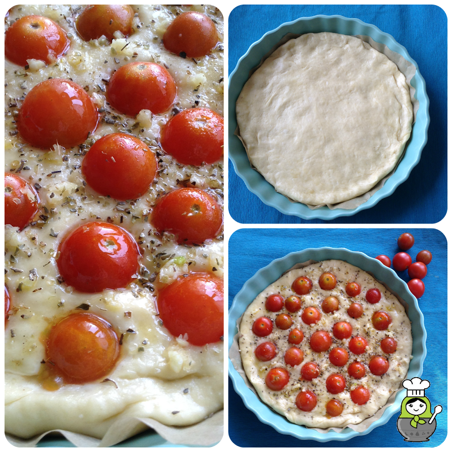 Cortamos los tomatitos por la mitad y los colocamos por toda la masa presionando ligeramente.