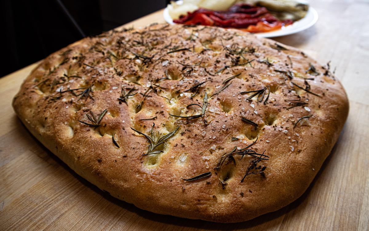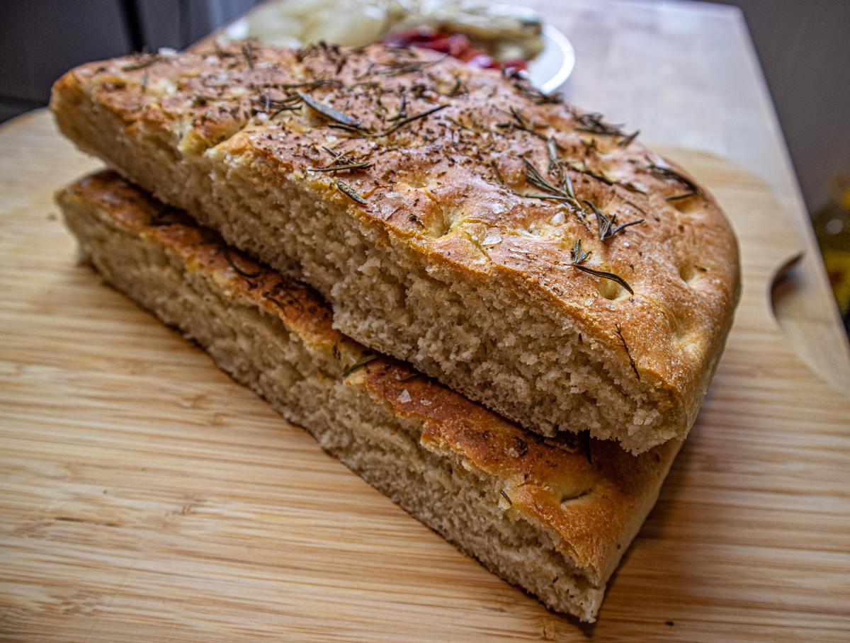 Amasa durante 20 minutos a mano o a máquina. deja reposar 3h en la nevera (así se activa el gluten que le da elasticidad a la masa). Saca de la nevera 1hora, luego extiende la masa sobre una bandeja con papel de horno, añade aceite deoliva virgen extra por encima y unas gotas de agua (puedes usar un pulverizador de agua), tapa con un trapo húmedo o lo que tengas y deja que leve otra hora a temperatura ambiente. Por último añade sal en escamas, romero y orégano y métela con el horno precalentado al máximo durante media hora a 205ºC.