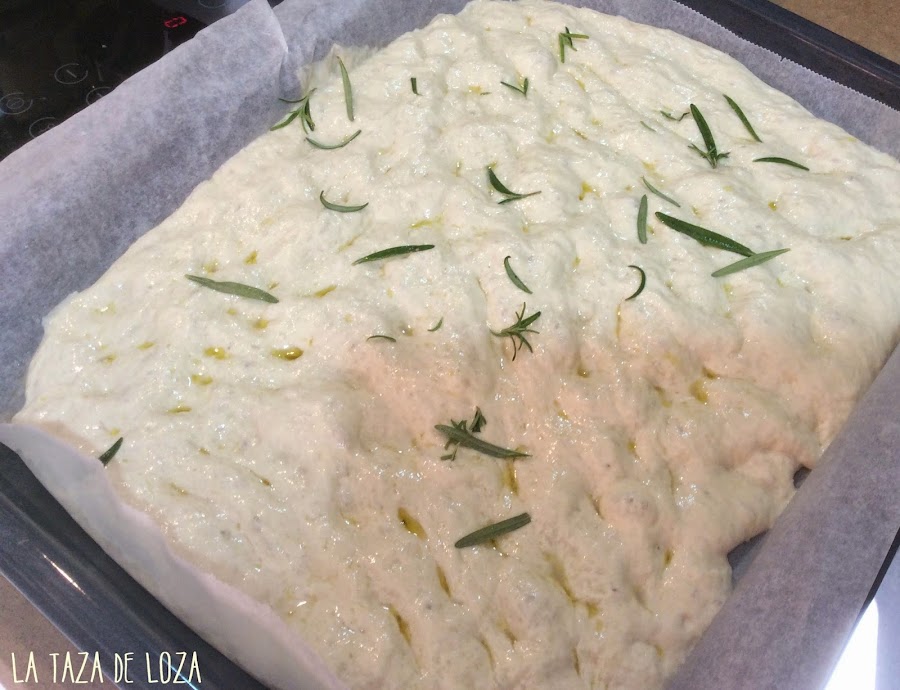 Se saca y se pone sobre una bandeja de horno aceitada para que nos se nos pegue. En este momento, que ya se le tiene que dar forma rectangular, con los dedos le hacemos las "marcas" típicas de este pan italiano, se hacen con un pequeño recipiente de agua y unas gotas de aceite, nos mojamos los dedos y hacemos las marcas.