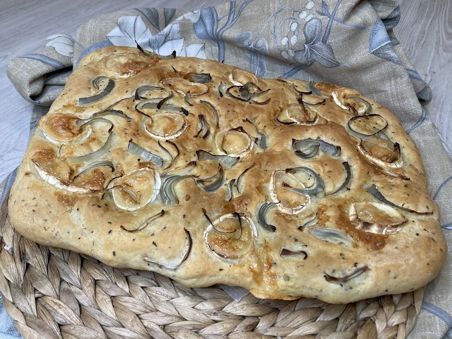 Ponemos las rodajas de queso por toda la focaccia y encima la cebolla.