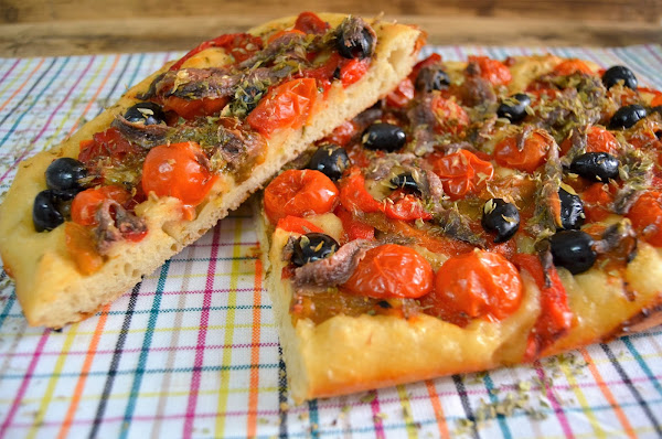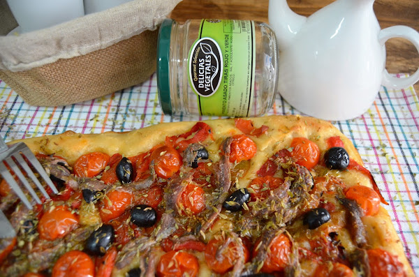 Usamos el aceite de las anchoas y lo añadimos por toda la masa, ponemos los pimientos asados, los tomates cherrys cortados por la mitad, las aceitunas negras cortadas también por la mitad, las anchoas y espolvoreamos con orégano, volvemos a tapar con papel transparente y dejamos reposar otros treintas minutos.