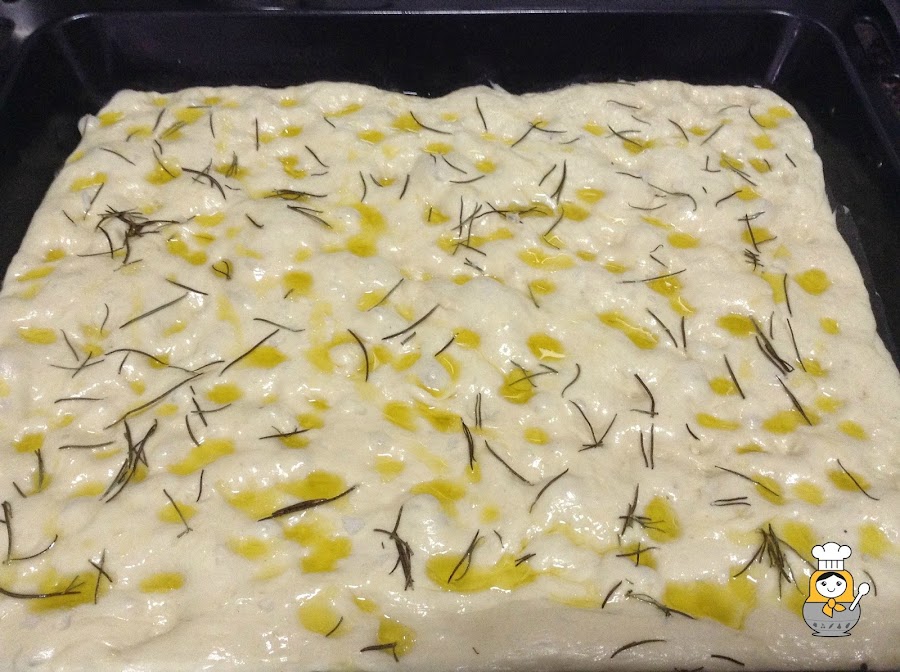 Ahora nos untamos la punta de los dedos con aceite y hacemos pequeños hoyuelos por toda la superficie. Por último esparcimos por encima un poco de aceite virgen extra, la sal gruesa y unas hojas de romero.