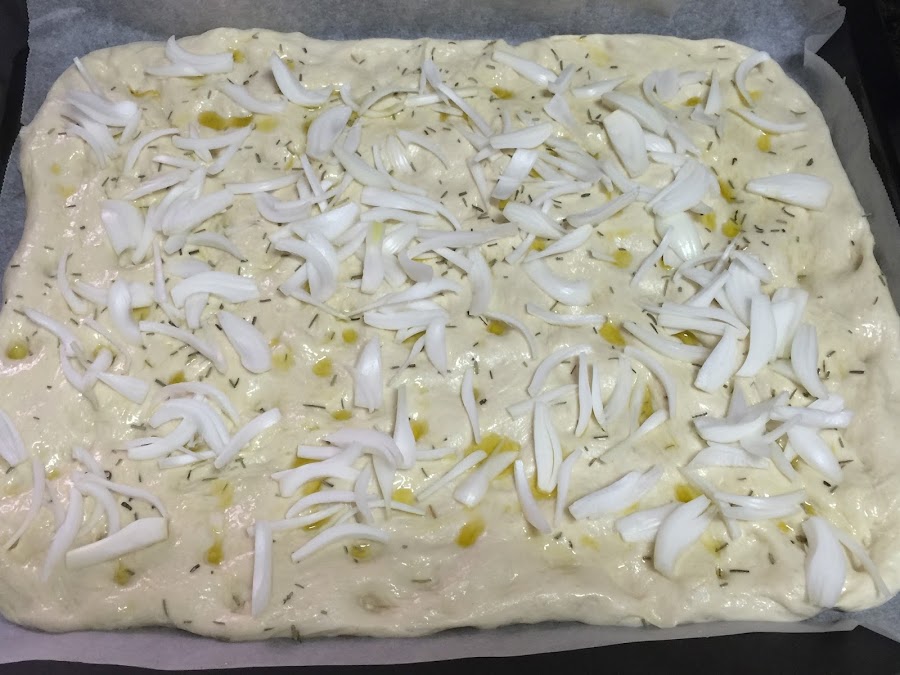 Esparcimos la cebolla, los tomates y las aceitunas por toda la bandeja y espolvoreamos el romero.
