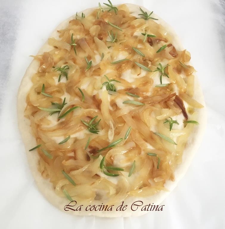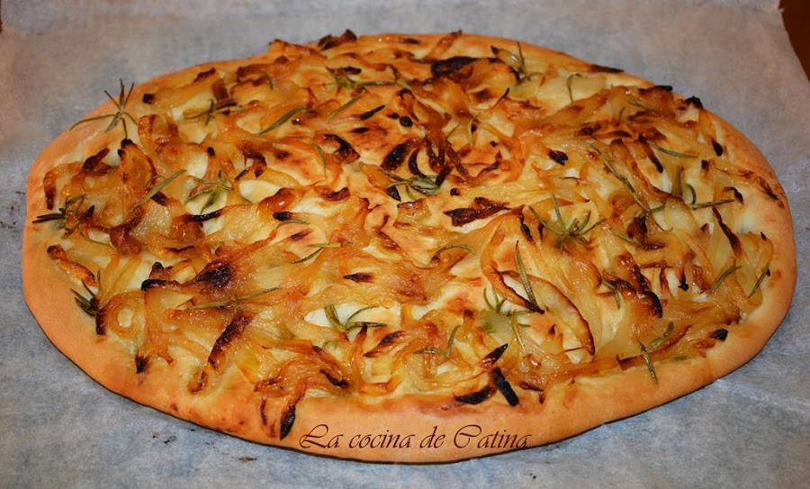 Cubrimos la masa ya extendida con la cebolla y unas ramitas de romero, la metemos al horno y la mantenemos durante unos 20 minutos.