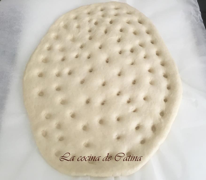 Forramos una bandeja de horno con papel sulfurizado, colocamos la masa sobre la bandeja y la vamos estirando con las yemas de los dedos hasta que consigamos mas o menos un grosor de un centímetro.