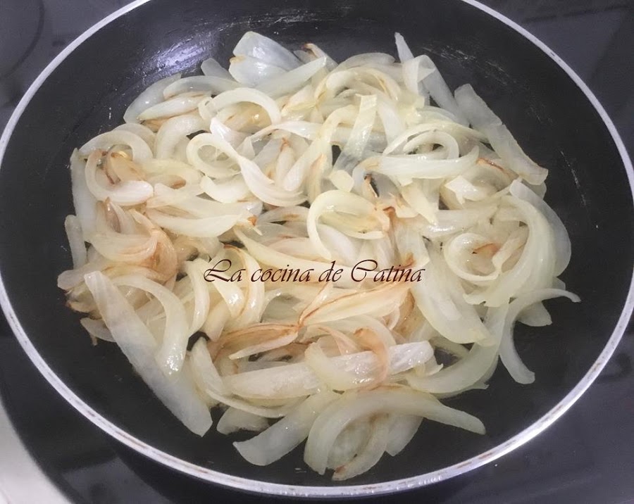 El relleno lo preparamos de la siguiente manera: Ponemos aceite a calentar en una sartén y freímos la cebolla cortada en juliana, a fuego lento, hasta que se vea dorada (esta preparación del relleno la vamos haciendo mientras reposa la masa).