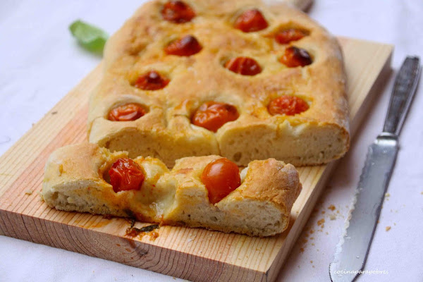 La focaccia una receta tradicional italiana, es un tipo de pan plano condimentado un poco a gusto, hay quien le pone hierbas aromáticas, aceitunas o como en nuestro caso tomatitos y albahaca.
