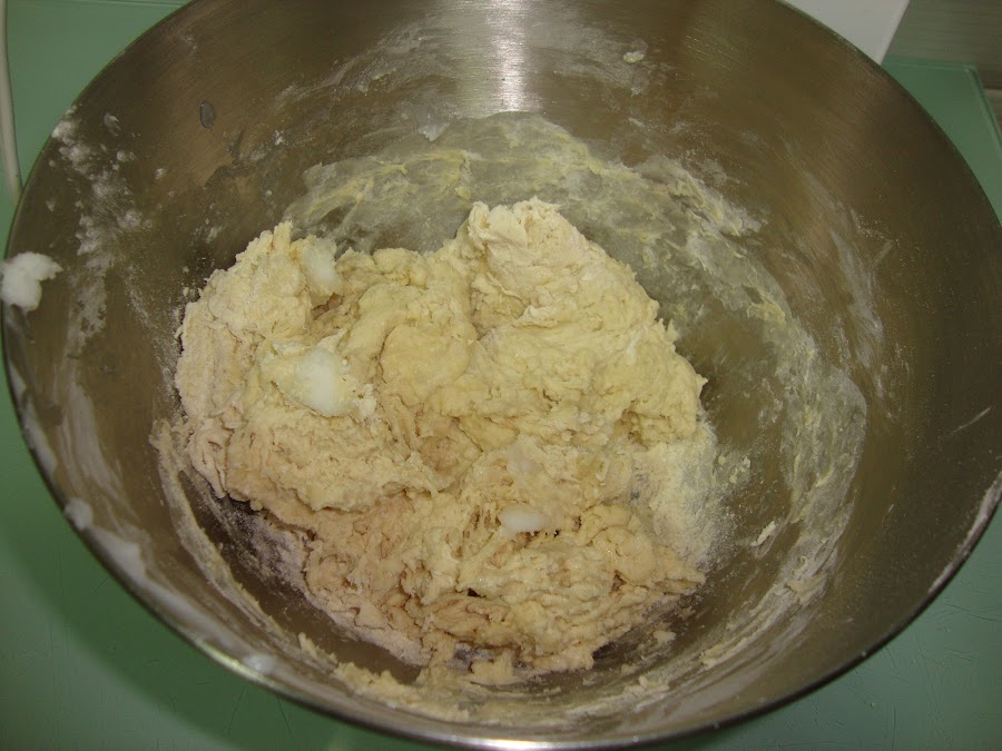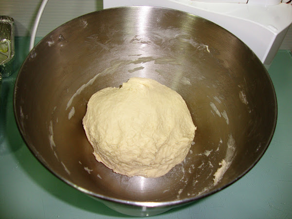 Ponemos todos los ingredientes excepto la levadura en un cuenco y amasamos hasta que la masa sea homogénea, luego añadimos la levadura y seguimos amasando hasta que la masa quede lisa y no se pegue.