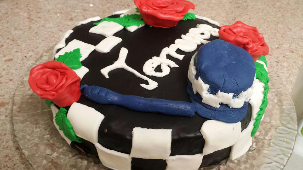 Él era policía y ésta era su gorra. Así que quise recrearlo en la tarta que hice. Teñí fondant blanco con colorante rojo y verde para hacer las rosas y azul marino para hacer una pequeña gorra y una porra también.