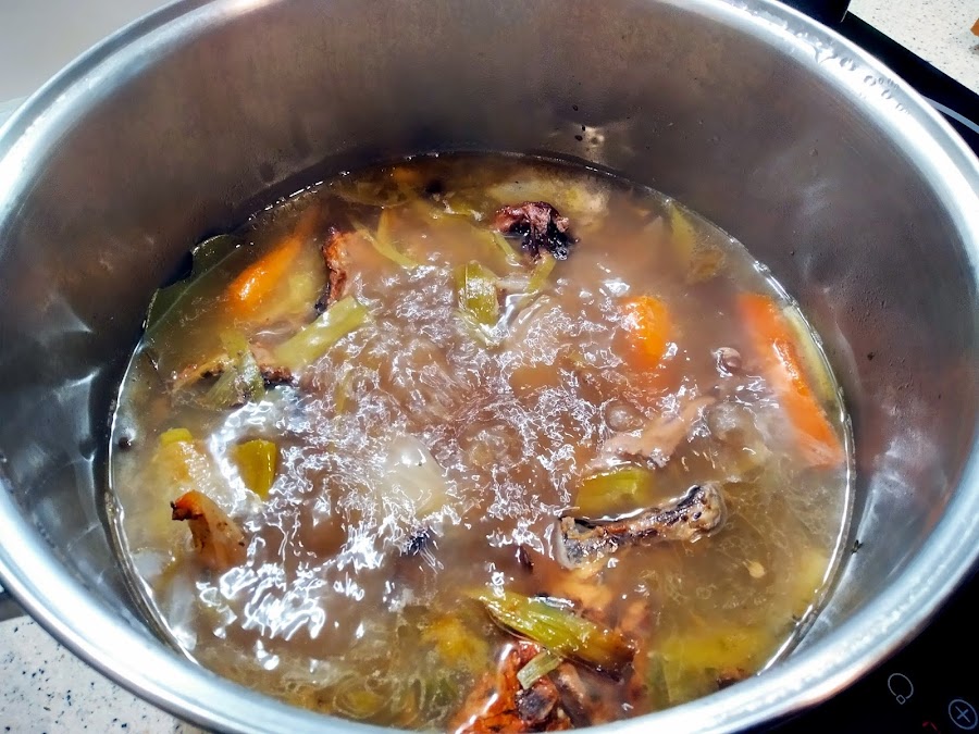 Pero les puedo asegurar que no es un caldo cualquiera. Es sin lugar a dudas lo que se denomina en cocina “un fondo de cocción”, un caldo en ésta ocasión oscuro que hará toda la diferencia en sabores para las salsas, estofados o sopas que puedan realizar sin necesidad de añadir los polvos, caldos o pastillas ya preparados, industriales que encontramos en cualquier supermercado y mucho más saludable ¿no creen?.