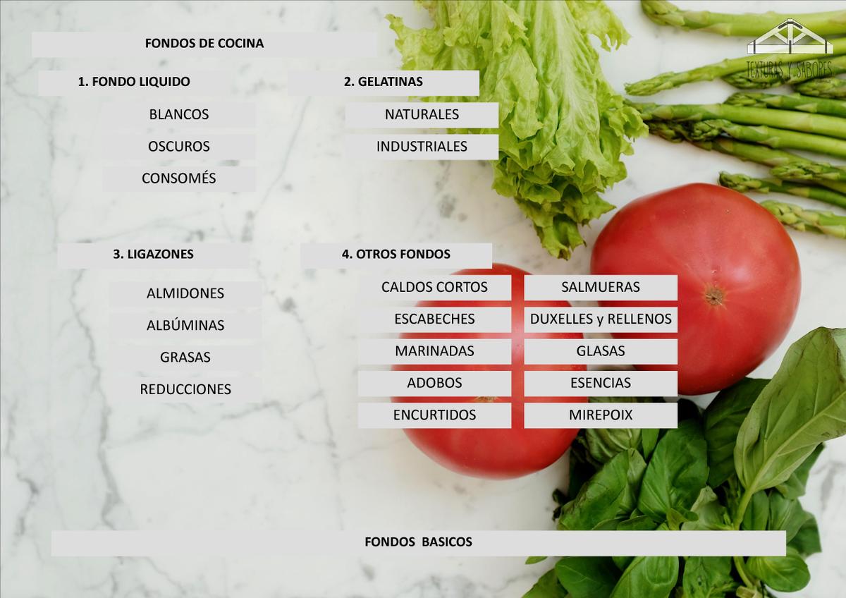 El tema de fondos de cocina son preparaciones que se elaboran con tiempo y sirven de base para otras elaboraciones culinarias, hay gran variedad desde caldos aromatizados hasta un elemento de ligazón. Es importante conocer cada una de ellas.