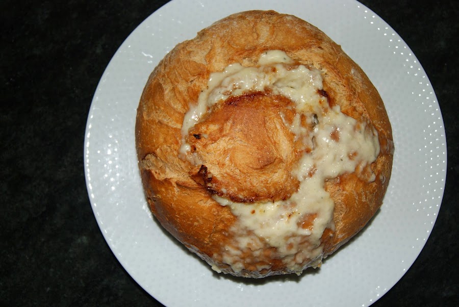 5) Sacamos el pan y le retiramos el papel. Servimos inmediatamente. Para degustarlo, vamos cortando trozos de pan y mojándolos en el queso, por eso os decía que era más cómodo hacerlo en un pan de kilo, en el de medio queda más justo y el queso puede derramarse, lo que deberíais considerar es que es un plato contundente y, si no sois muchos, puede que el pan de kilo sea demasiado grande. Otro punto a tener en cuenta es que podéis añadir otros quesos, pero cuidado sobretodo con los quesos azules, ya que son muy fuertes y pueden resultar demasiado pesados. Dejad volar vuestra imaginación.