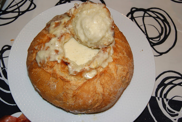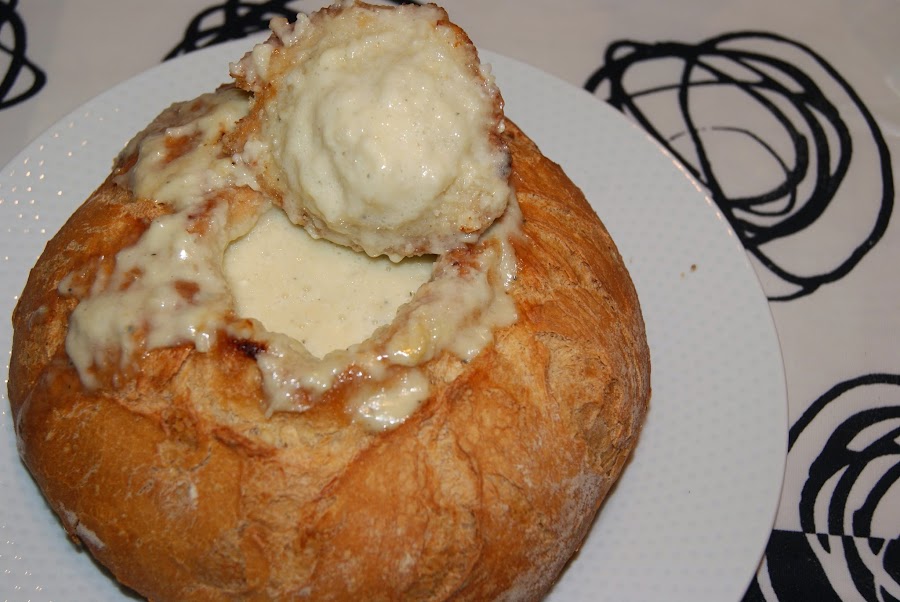 5) Sacamos el pan y le retiramos el papel. Servimos inmediatamente. Para degustarlo, vamos cortando trozos de pan y mojándolos en el queso, por eso os decía que era más cómodo hacerlo en un pan de kilo, en el de medio queda más justo y el queso puede derramarse, lo que deberíais considerar es que es un plato contundente y, si no sois muchos, puede que el pan de kilo sea demasiado grande. Otro punto a tener en cuenta es que podéis añadir otros quesos, pero cuidado sobretodo con los quesos azules, ya que son muy fuertes y pueden resultar demasiado pesados. Dejad volar vuestra imaginación.