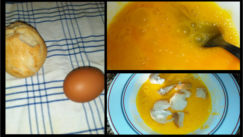 Se bate el huevo y luego se echa el pan desmenuzado en él, se revuelve bien y se mezcla para que se empape bien con el huevo