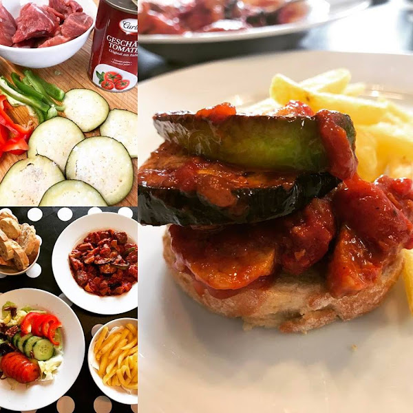 En una sartén, freímos los pimientos, luego las berenjenas. Reservamos. Freímos la carne y cuando esté dorada, salpimentar y agregar el tomate. Machacar un poco y cuando empiece a hervir incorporamos una cucharada sopera de azúcar. Reducir el fuego, mover de vez en cuando. Veremos qué se va consumiendo el agua del tomate, quedando espeso y brillante; rectifica la sal; en este momento ponemos las hortalizas reservadas y mezclamos.