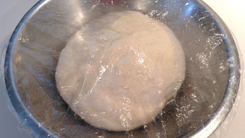 Pon la bola de masa en un bol y cubre con un plástico o con un trapo. Deja levar 2-3 horas hasta que suba la masa bastante, como al doble de su volumen.