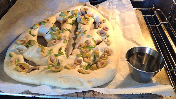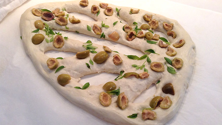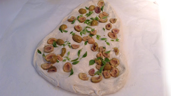 Se estira la masa dándole forma de triángulo y se le incrustan las aceitunas sin hueso y las hojas de albahaca (esta es de hoja pequeña) por la superficie.