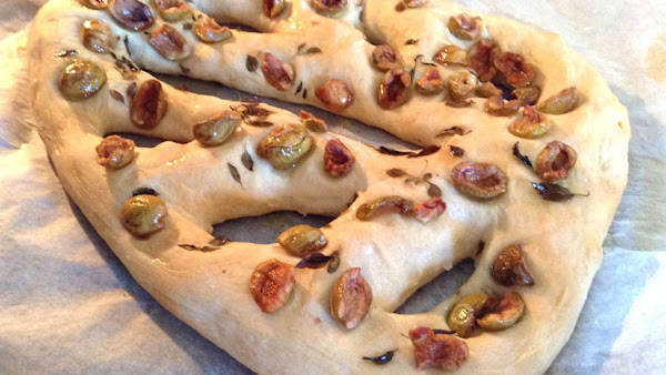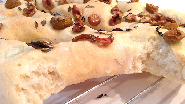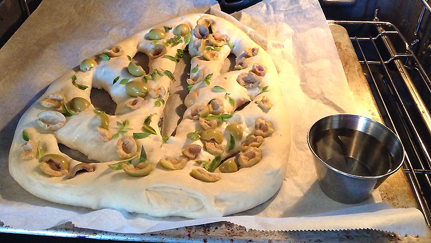 Hornea el pan a 180º C -356º F- durante unos 20-25 minutos. A media cocción riego la masa con un chorrito de aceite de oliva.