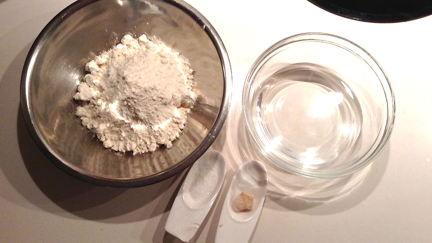 Por un lado se mezclan harina y sal, por otro agua y levadura. Junta harina sazonada y agua con levadura y amasa un poco hasta hacer una bola.