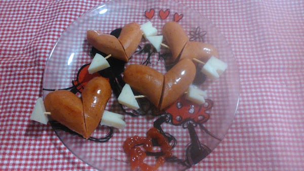 En mi entrada anterior os hablaba de una empresa de frankfurts on line que se llama salsicheros.com y en la que se venden los supermega conocidos frankfurts,hamburguesas,chistorra...de Casa Vallès y que se consumen en el famoso Frankfurt Pedralbes.Pues quería sorprender a mi familia y aunque no hay un solo día que no les diga que los quiero quise sorprenderles así... son muy muy fáciles de hacer y quedan super cucos la verdad (he dicho cucos??jajajaja) Teneis que coger las puntas de los franfurts o cervela y cortarlas en diagonal y con un palillo unirlas.El resto no los he tirado eh.Cogeis queso y haceis la flecha.Lo acompañais con salsa de tomate y unas patatas y triunfareis!! Una manera diferente de decir te quierooo