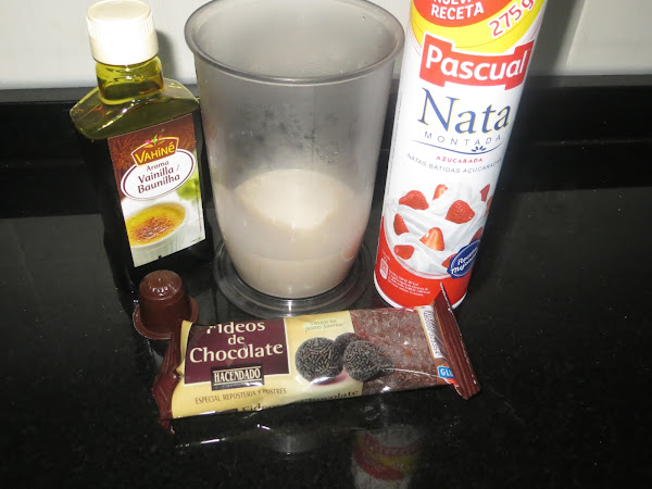 Echamos en el vaso de la picadora el café, la leche, el azúcar, la esencia de vainilla y los cubitos de hielo. Batimos bien, lo echamos en un vaso y decoramos con la nata (crema de leche) y los fideos de chocolate. Es una receta que sirve como desayuno o merienda.