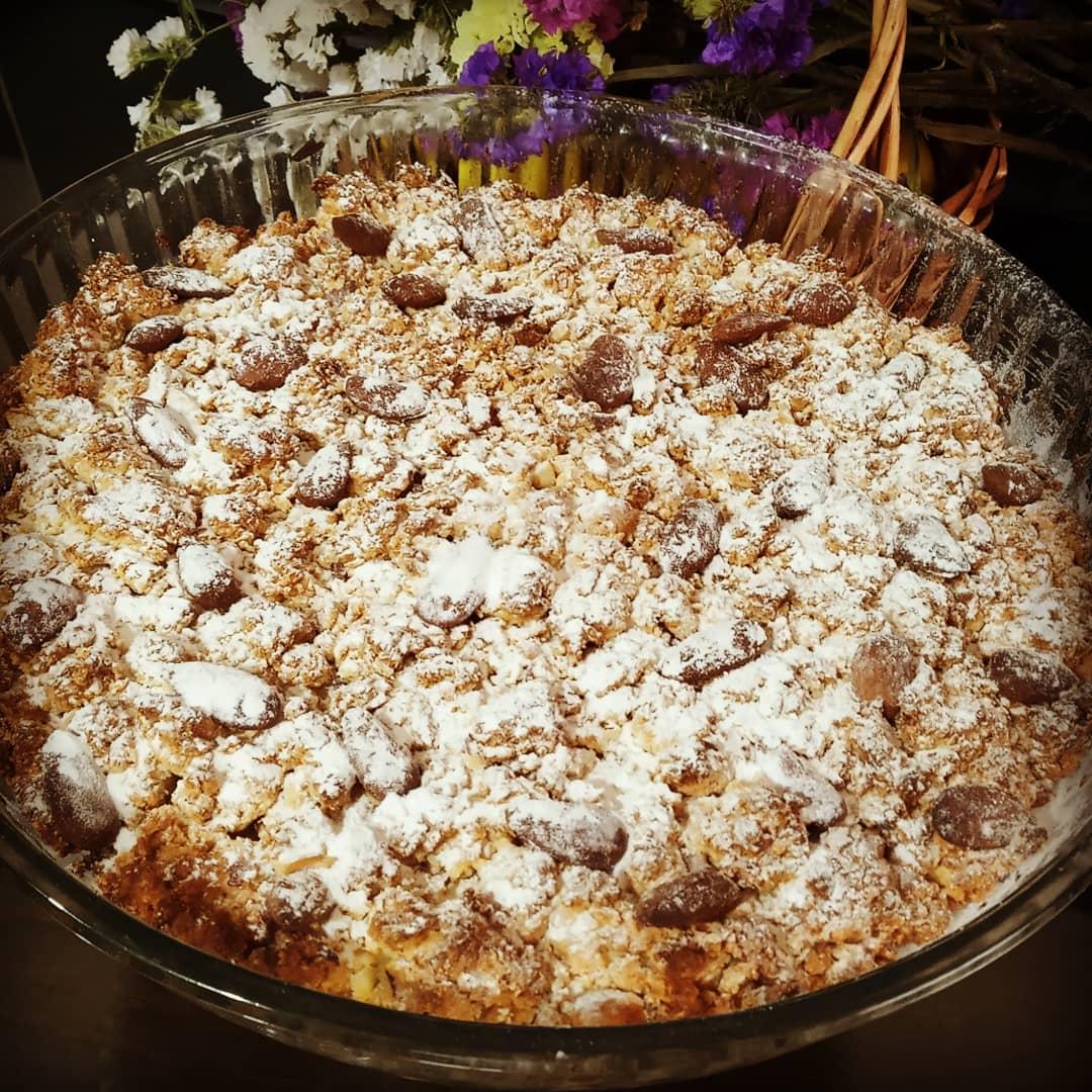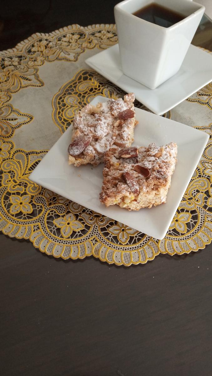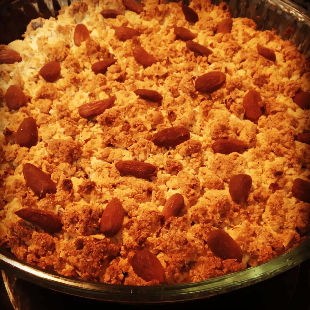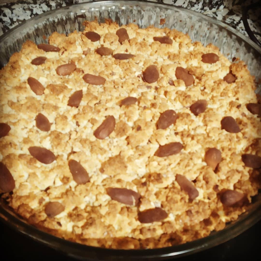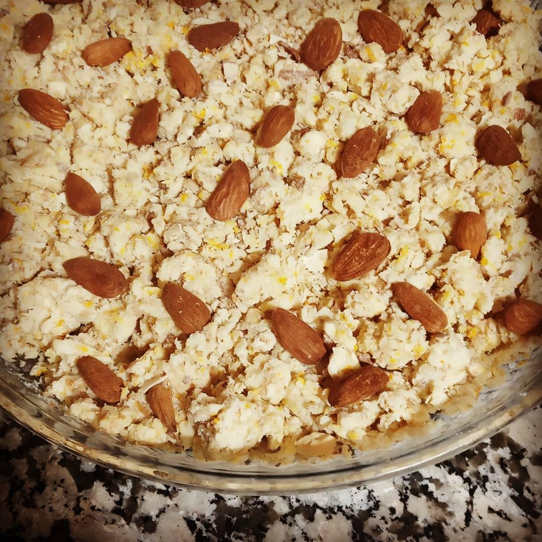 Rellenar un molde grande untado con aceite formar una sola capa, alisar y nivelar con delicadeza. Decorar con las almendras enteras.( Espolvorear con azúcar si quieres)