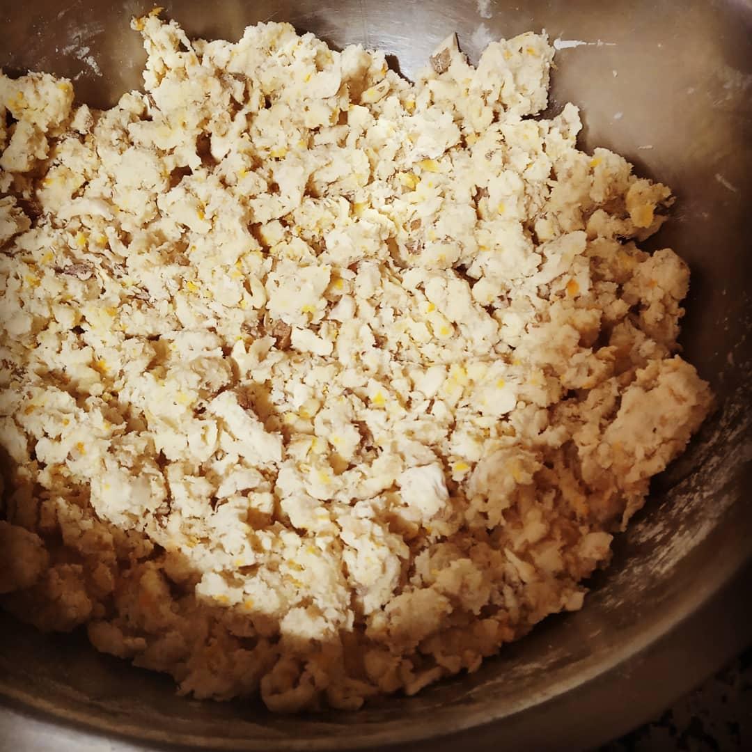 Mezclar la harina con el azúcar y las ralladuras, añadir la nata (crema de leche) y resto de los ingredientes, desmenuzar todo con las manos haciendo migas.