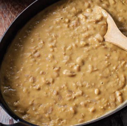 La noche anterior a la preparación poner a remojar los frejoles en un bol grande con abundante agua. Al día siguiente, pelar los frejoles y ponerlos a cocinar en una olla con agua que los cubra y el hueso de jamón de pierna. Al dar el primer hervor, escurrir el agua y volver a llenar la olla con agua caliente. Respetar esto, ya que si se añade agua fría los frejoles se pasmarán y endurecerán. Dejar al fuego hasta que los frejoles estén cocidos y se deshagan. Retirar la olla de la hornilla y escurrir el agua. Batir la mitad de los frejoles y luego mezclar con el resto. En una sartén calentar el aceite sobre fuego medio y dorar la cebolla y el ajo por 10 minutos. Luego agregar el ají mirasol, dorar por 5 minutos y añadir el ajonjolí tostado. Condimentar con sal y pimienta. Incorporar el sofrito de cebolla a los frejoles. Probar y rectificar la sazón si fuera necesario. Remover bien y cocinar sobre fuego lento hasta que la preparación espese. Agregar el ají amarillo asado, dejar reposar y servir con un chorrito de aceite de oliva por encima y la salsa criolla. Salsa criolla Colocar en un bol la cebolla cortada en pluma, el ají limo, las hojas de culantro y el jugo del limón. Sazonar con sal, remover bien y servir.