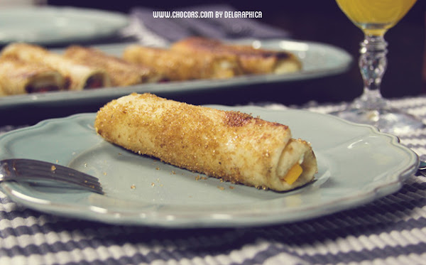 Rellenar la rebanada de pan con el relleno que más os apetezca. Rellenar un extremo de la rebanada y enrollar.
