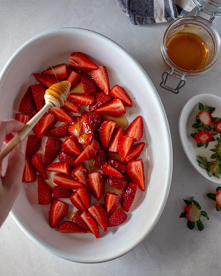 Lavamos y cortamos las fresas en cuartos. Las colocamos en una bandeja para horno y añadimos la miel por encima, removemos un poco y las metemos en el horno 180ºC con calor arriba y abajo durante 15. Deja que se enfríen y luego las puede utilizar enteras o triturarlas un poco con la batidora para que queden con textura de compota.