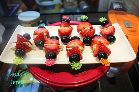 A continuación vamos insertando en un palillo o similar una aceituna, un trozo de fresón, el lomo de boquerón doblado, otro trozo de fresón y finalizamos otra aceituna negra.