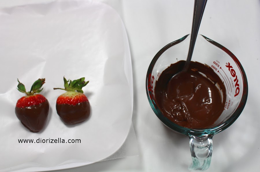Agarra la Fresa por la parte verde. Sumerge la en el Chocolate. Escure el exceso de Chocolate sacudiendo la fresa. Recuerda que la Fresa debe estar lavada y secada. Coloca las fresas en un plato con papel encerado y las vas a poner en la nevera por varios minutos hasta que el Chocolate se endurezca. Retira las Fresas del plato y colócalas en capacillos.