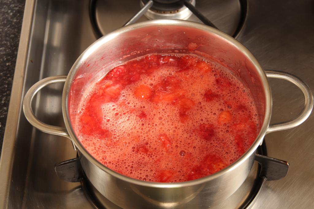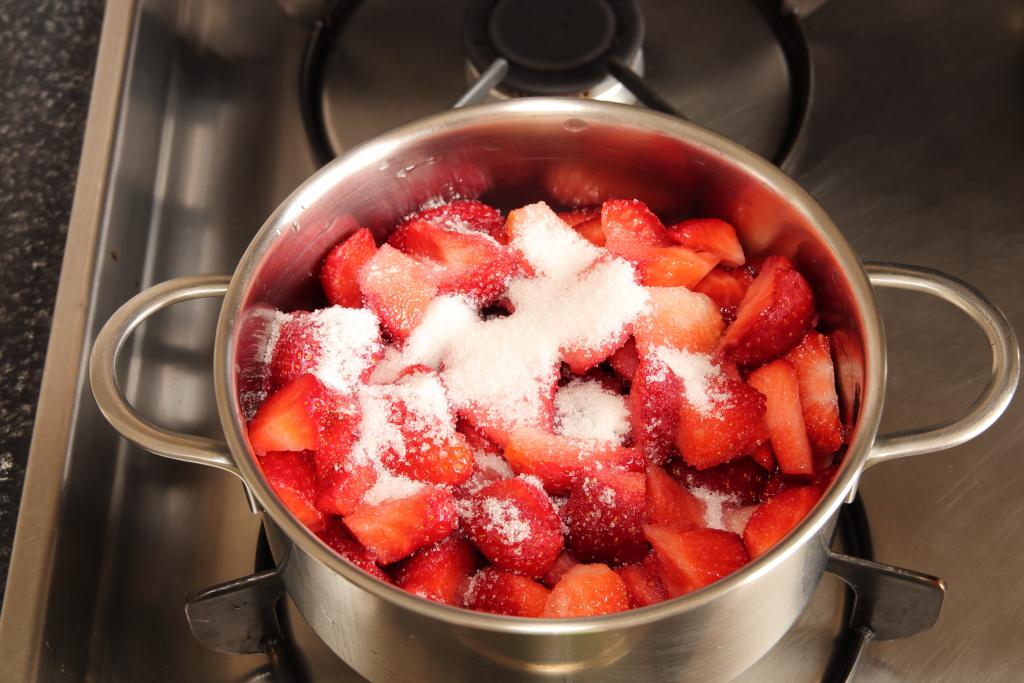 Para la salsa necesitamos unos 500 gr de fresas limpias y sin pedúnculo, así que limpiamos las fresas bajo el grifo de agua fría, retiramos el pedúnculo, troceamos y ponemos en un cazo, agregamos el azúcar, calentamos y removemos hasta que medio se deshagan. Reservamos.
