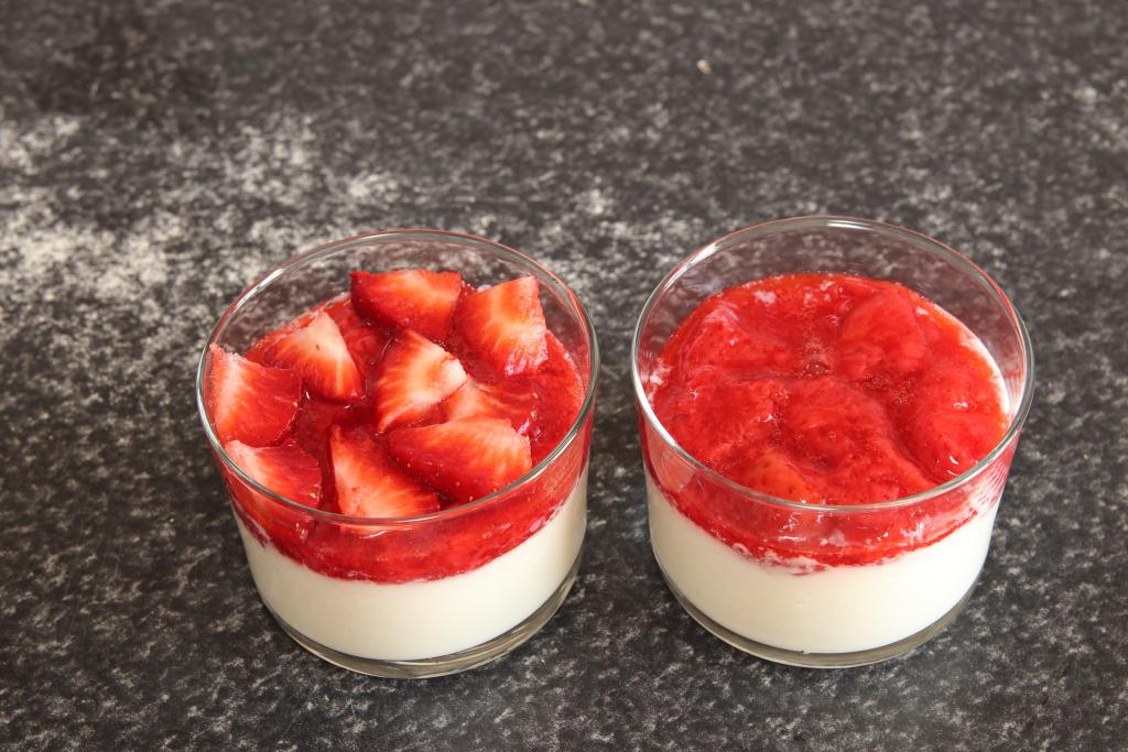 Para servir, ponemos un poco de la salsa de fresas en cada vasito con la leche cuajada, repartimos por encima unas fresas picadas y decoramos con unas hojitas de menta (opcional).