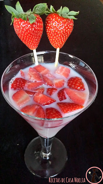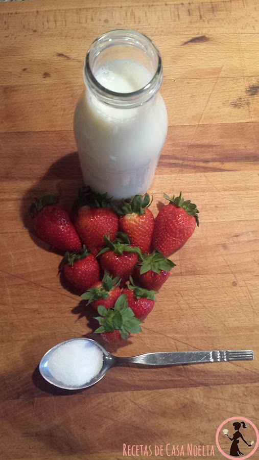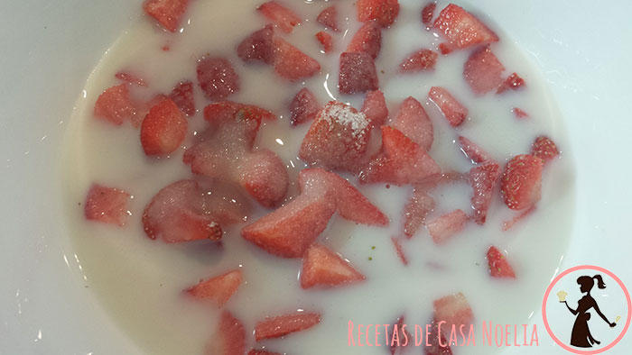 Después hay que echarles la leche (si puede ser entera). la cantidad de leche que eches es a tu elección: yo le echo hasta que las fresas empiezan como a flotar, porque las fresas dan un sabor a la leche... riquísimo!