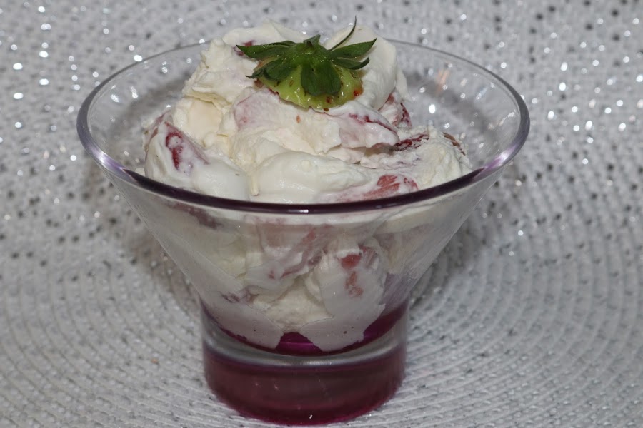 Mezclar la nata (crema de leche) con las fresas y al frigo hasta que las vayáis a consumir.