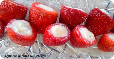 Corta las fresas por el cabito y vacíalas un poco con la punta de un cuchillo. Rellena con el queso.