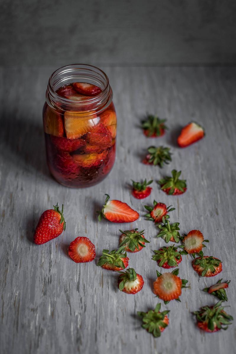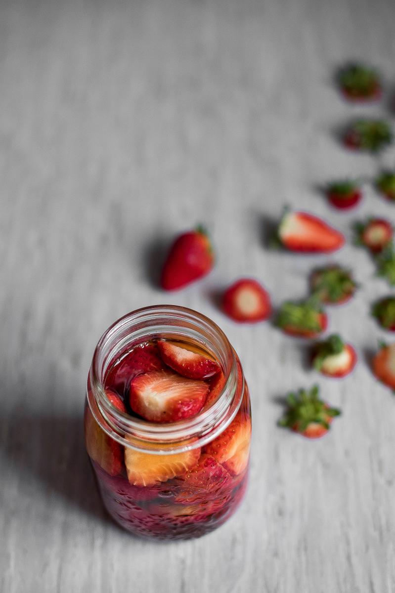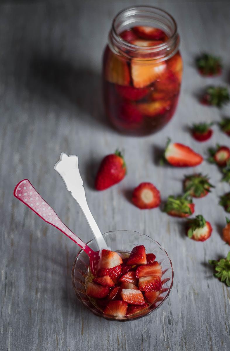 Lava las fresas, quita el rabito y parte a la mitad (o déjalas enteras). Introduce en un frasco de cristal limpio y seco.