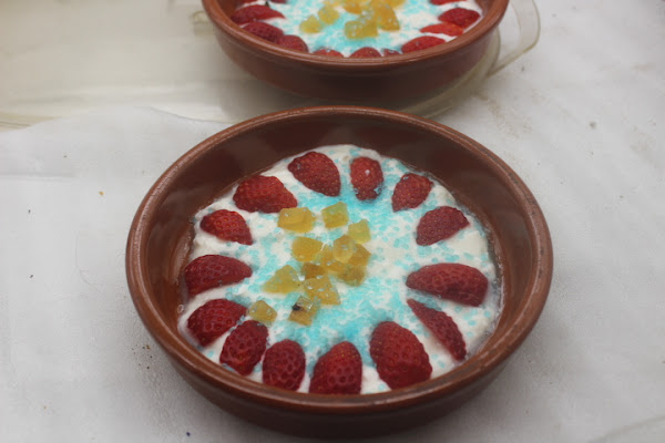 Colocamos un yogurt en cada cazuelita de barro (o plato donde sirváis) y cubrimos su fondo, esparciendo bien el yogurt.