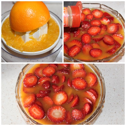 Añadimos a las fresas el zumo de naranja, el chorrito de vino dulce y la pizca de canela y las dejamos reposar en el frigorífico unas horas o hasta el día siguiente.