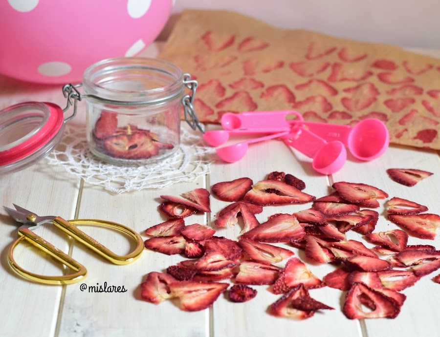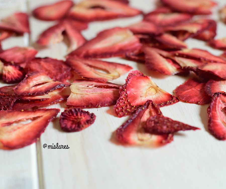 1. Limpiamos las fresas y las laminamos finitas para que cueste menos secarlas.
