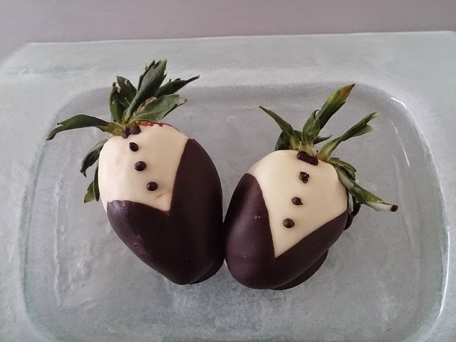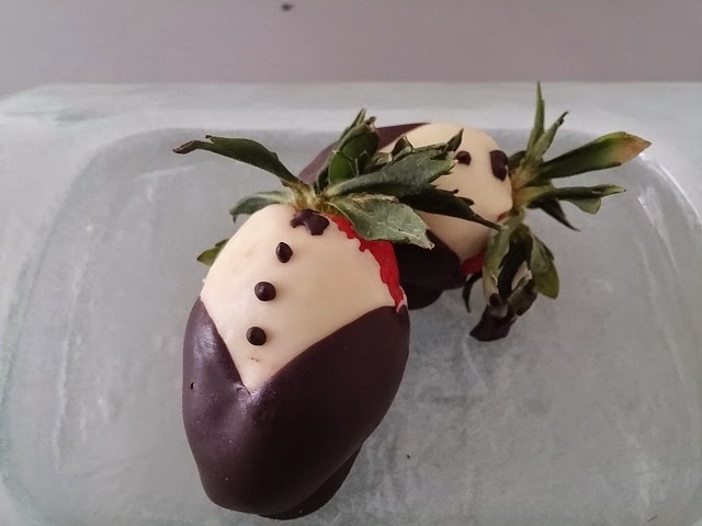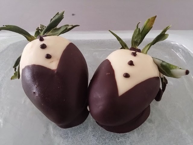 Preparación: Una ve que tenemos las fresas bien lavadas y bien secas fundir la cobertura blanca y bañar no del todo las fresas, con cuidado, de una en una y sacudiendo el exceso de chocolate. Dejar secar en la nevera. Luego fundir la cobertura negra y bañar las fresas de un lado y del otro para que el blanco quede a modo de camisa. Dejar en la nevera un buen rato y luego si se quiere hacer son la cobertura negra unos detalles sobre el blanco. Dejar en la nevera y a la hora de comerlas sacarlas un ratito antes para degustarlas adecuadamente.