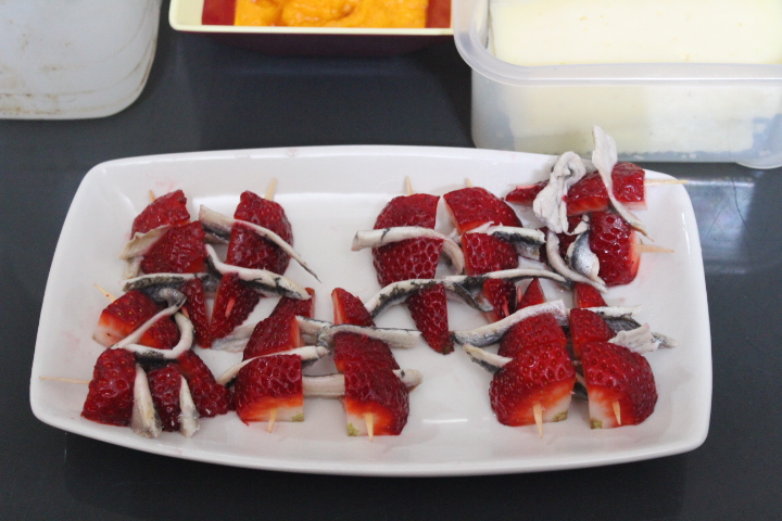 Insertamos en palillos, tres trozos de fresón, intercalando entre ellos dos lomos de boquerón.