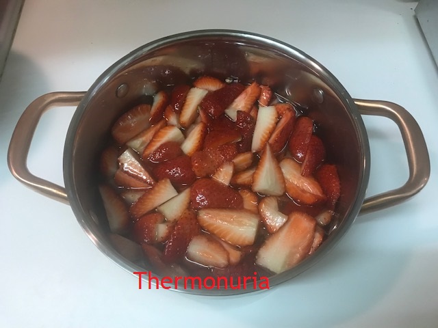 Cuando el almíbar este listo, lo pondremos hirviendo sobre los fresones hasta cubrirlos. Tapamos y dejamos 24 horas.