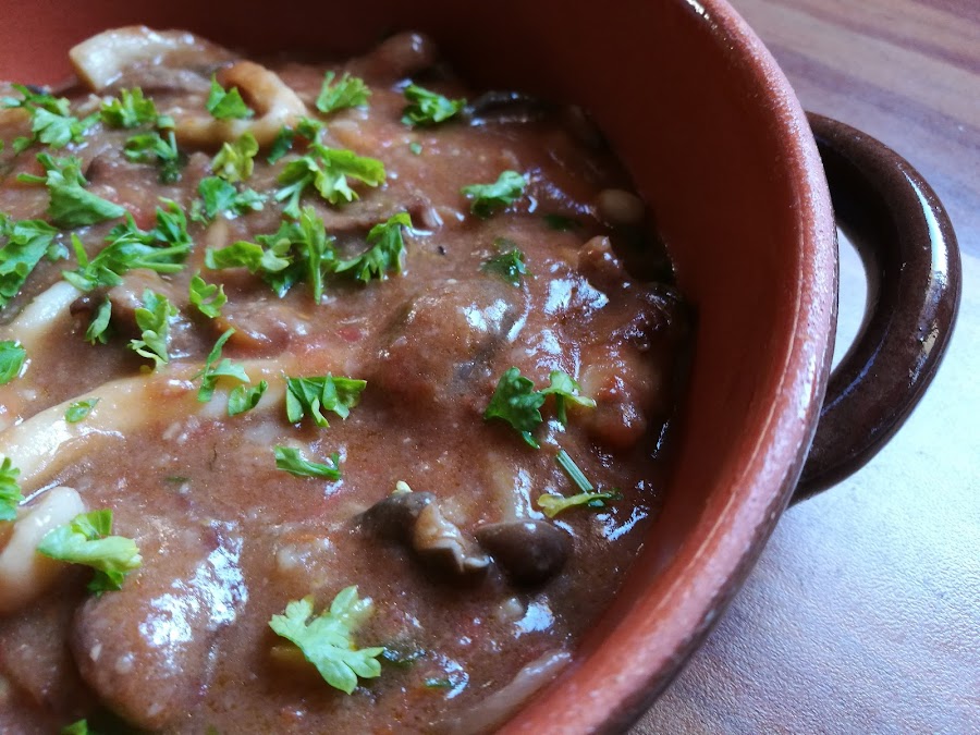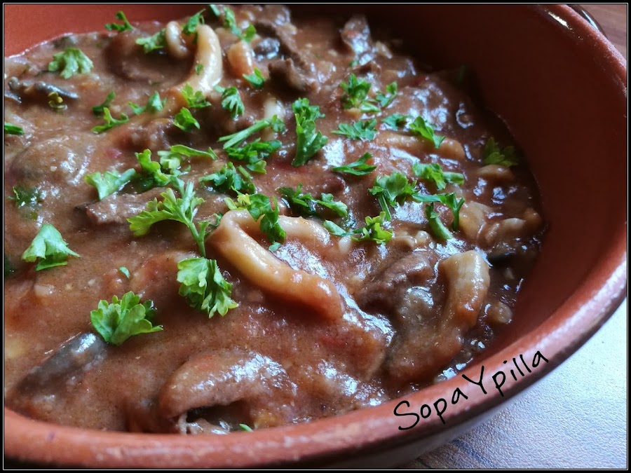 - Cuando falten 20 minutos para acabar, añadimos las setas, hacemos una picada con todos los ingredientes, en el mortero y añadimos también. Tapamos y dejamos acabar de cocer.