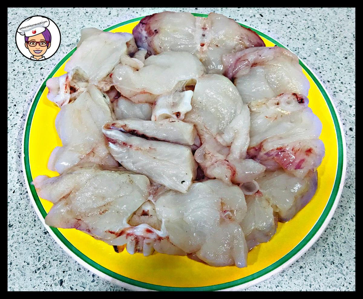 El sábado paseando por la Boqueria de Barcelona (mi mercado favorito, me podría tirar horas y horas allí) Vi un rape que me llamaba y me dijo que tenía que venirse conmigo a casa, fue amor a primera vista ,3,5 kg nada más y nada menos y pensé este es el momento para poder hacer la receta que tenía en la lista de pendientes. (no lo gaste todo, use 12 rodajas y aun me quedaron 6 para congelar)